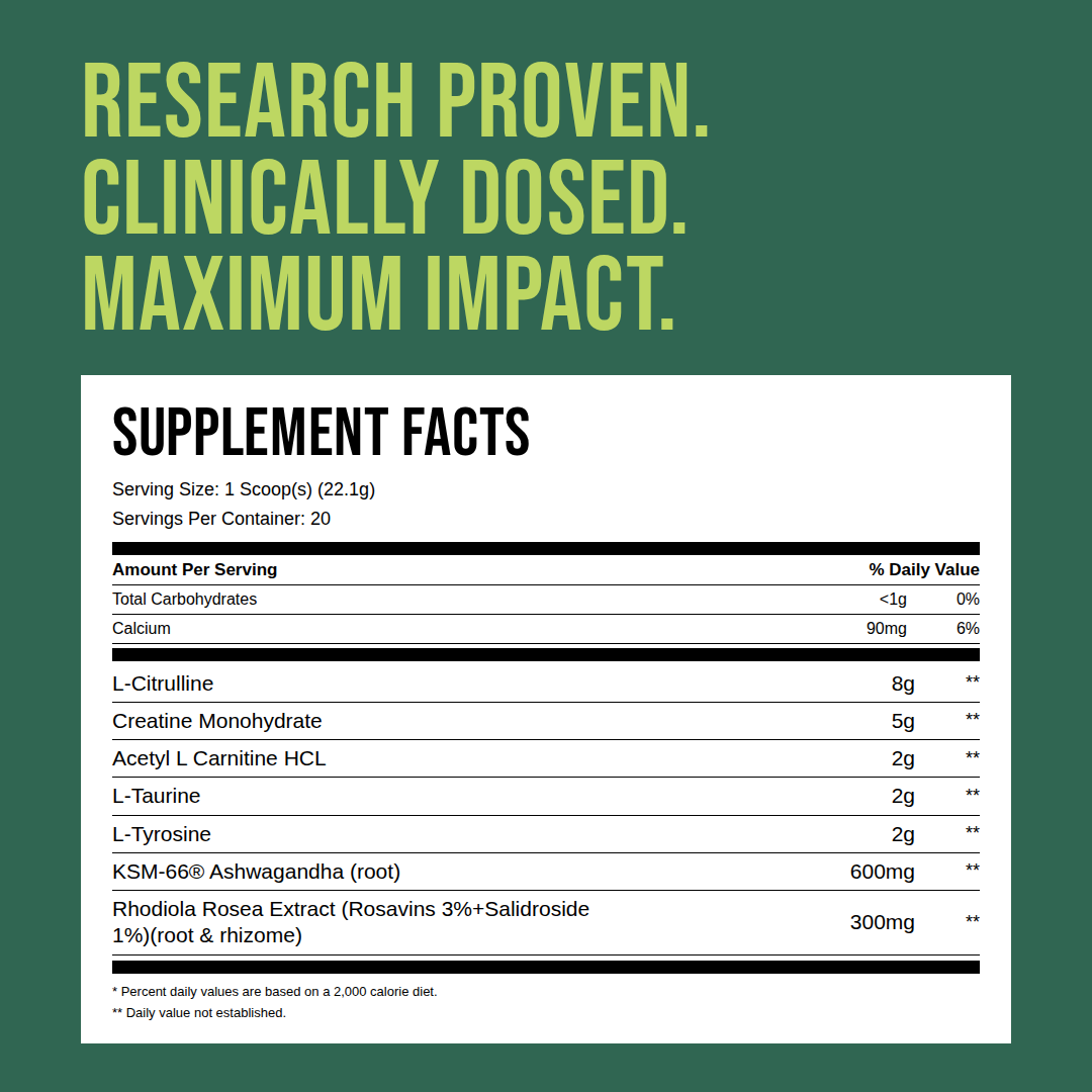 The most comprehensive stim-free product ever formulated -- optimized for strength, focus and recovery. Dosed according to clinical trial data, with Creatine, L-Citrulline, KSM-66® Ashwagandha and a host of adaptogens & nootropics that help you lock in and maximize your gains. No jitters, no shortcuts, no sacrifices.