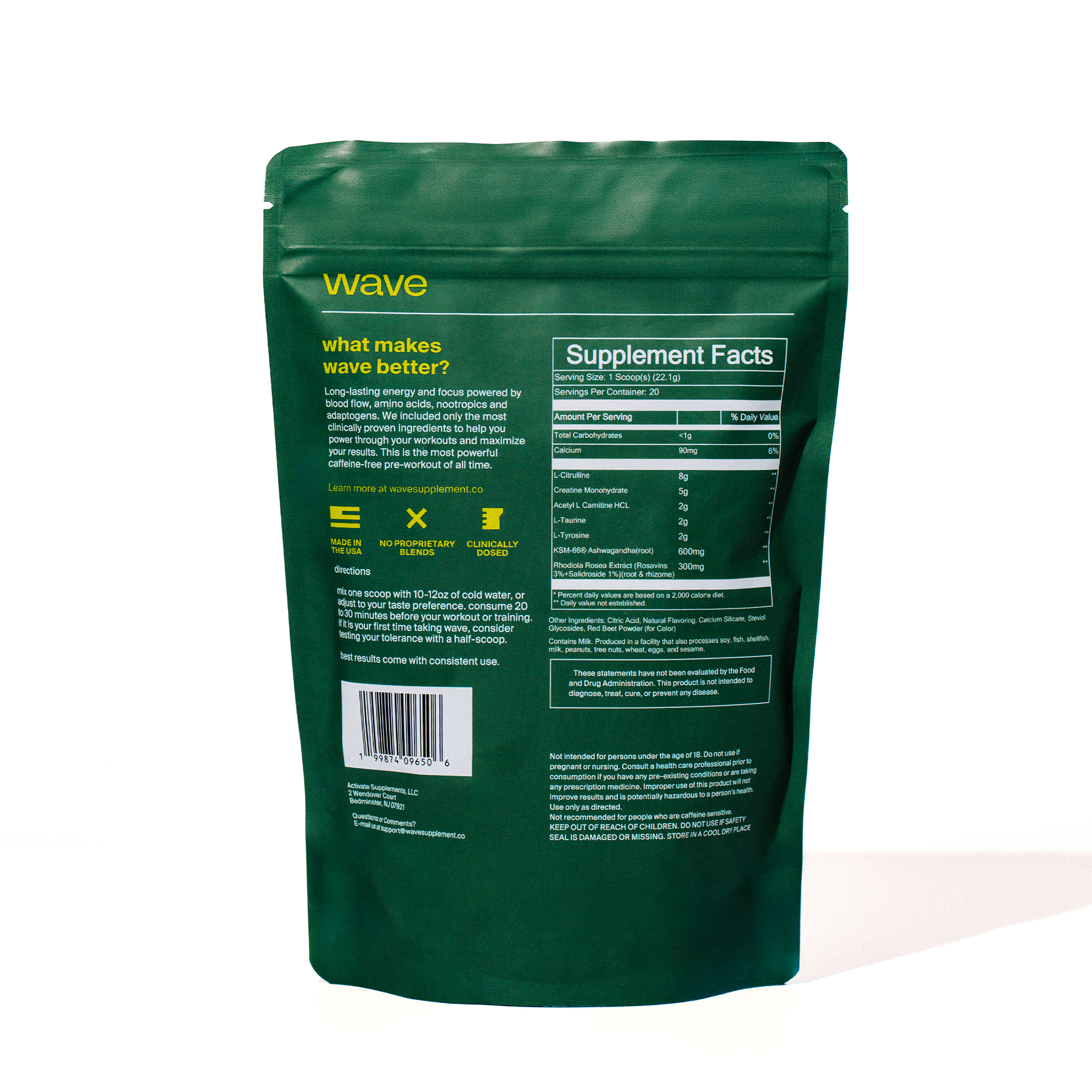 Mix one scoop with 10-12oz of cold water, or adjust to your taste preference. Consume 20 to 30 minutes before your workout or training. If it is your first time taking Wave, consider testing your tolerance with a half-scoop.